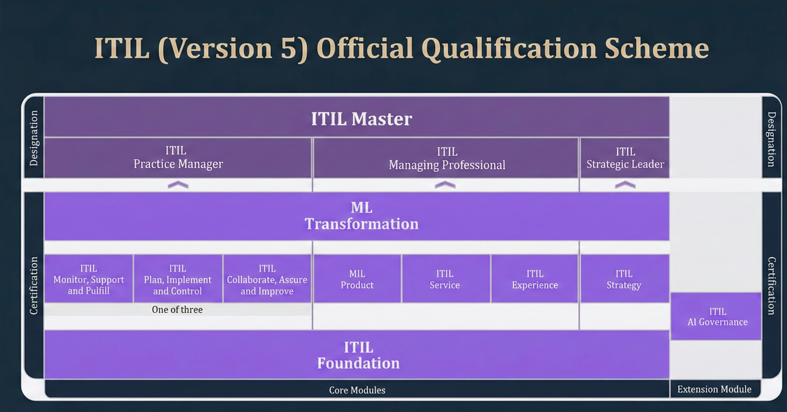 ITIL (Version 5)的認證架構經過精簡,分為基礎級、三大專業路徑及最高的大師級。所有進階路徑皆需完成基礎證照與一個通用的轉型模組。