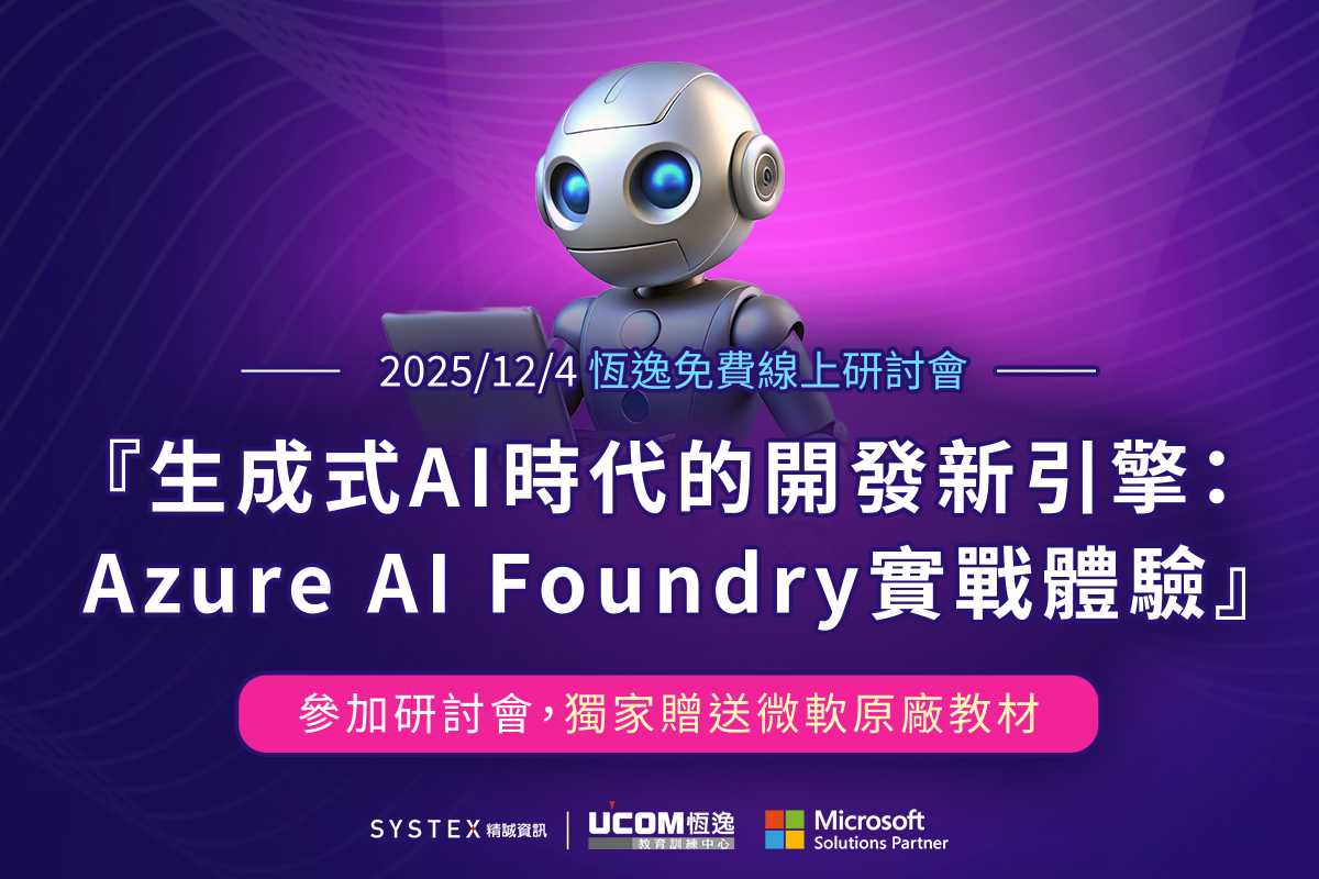 恆逸優惠活動總覽 Microsoft 365 Copilot實用範例教學,讓你輕鬆打造最得力的AI助理 microsoft 365 copilot實用範例教學,讓你輕鬆打造最得力的ai助理 microsoft 365 copilot實用範例教學,讓你輕鬆打造最得力的ai助理 251031_m365copilot.jpg Microsoft 365 Copilot實用範例教學,讓你輕鬆打造最得力的AI助理... 有效日期: 2027/12/31 恆逸免費線上研討會,獨家贈送Google原廠教材、原廠Lab 恆逸免費線上研討會,獨家贈送google原廠教材、原廠lab 恆逸免費線上研討會,獨家贈送google原廠教材、原廠lab 20251219_googleaiseminar.jpg 恆逸免費線上研討會,獨家贈送Google原廠教材、原廠Lab... 有效日期: 2025/12/19 UI/UX新手先從Figma開始 ui/ux新手先從figma開始 超過95%的fortune 500企業採用figma,包括 amazon、netflix 等品牌。透過figma您可掌握真正主流設計工具! 261017_figma.jpg 超過95%的Fortune 500企業採用Figma,包括 Amazon、Netflix 等品牌。透過Figma您可掌握真正主流設計工具!... 有效日期: 2027/12/31 學會了,就是你的,PMP✕PBA✕ACP,一站式掌握PMI三大黃金認證 學會了,就是你的,pmp✕pba✕acp,一站式掌握pmi三大黃金認證 學會了,就是你的,pmp✕pba✕acp,一站式掌握pmi三大黃金認證 250909_pmix3.jpg 學會了,就是你的,PMP✕PBA✕ACP,一站式掌握PMI三大黃金認證... 有效日期: 2027/6/30 十年資安職涯養成 十年資安職涯養成 從電子科跨足資訊安全,恆逸助我打造網路、系統到資安的完整技能樹 250916_security.jpg 從電子科跨足資訊安全,恆逸助我打造網路、系統到資安的完整技能樹... 有效日期: 2027/12/31 RHEL 10 重磅登場 rhel 10 重磅登場 red hat原廠授權教育訓練中心,推出 rhce/rhcsa 認證課程與優惠,助您掌握實作能力。 190712_rhce.jpg Red Hat原廠授權教育訓練中心,推出 RHCE/RHCSA 認證課程與優惠,助您掌握實作能力。... 有效日期: 2027/12/31 ISC2資安專業的國際證明 isc2資安專業的國際證明 恆逸為isc官方授權訓練中心,有20多年的培訓經驗,正版授權教材並由官方認證講師授課,確保您學習到最專業的內容。 250824_isc2.jpg 恆逸為ISC官方授權訓練中心,有20多年的培訓經驗,正版授權教材並由官方認證講師授課,確保您學習到最專業的內容。... 有效日期: 2027/12/31 假日班降價優惠超有感 假日班降價優惠超有感 →lv1:容器管理 – 新手村必學→lv2:雲端部署 – 進階副本解鎖→lv3:ai 部署 – ai/ml 一鍵上線 250801_openshiftho.jpg →LV1:容器管理 – 新手村必學→LV2:雲端部署 – 進階副本解鎖→LV3:AI 部署 – AI/ML 一鍵上線... 有效日期: 2027/12/31 最完整敏捷系列課程 最完整敏捷系列課程 為什麼90%的團隊導入敏捷後, 反而效率更低? 從基礎認知到實戰應用,重建你的敏捷管理邏輯體系 250812_agileall.jpg 為什麼90%的團隊導入敏捷後, 反而效率更低? 從基礎認知到實戰應用,重建你的敏捷管理邏輯體系... 有效日期: 2026/12/31 AI時代:新手PM的入場指南 ai時代:新手pm的入場指南 當ai能處理重複性工作時,人類最需要的反而是「統籌全局」、「協調資源」、「解決複雜問題」的能力。而這些,正是專案經理的核心技能。 20250819_compj.jpg 當AI能處理重複性工作時,人類最需要的反而是「統籌全局」、「協調資源」、「解決複雜問題」的能力。而這些,正是專案經理的核心技能。... 有效日期: 2027/6/30 Angular新功能全面解析 angular新功能全面解析 最快寫出更精簡、更高效能的前端開發專案 250701_angular.jpg 最快寫出更精簡、更高效能的前端開發專案... 有效日期: 2027/12/31 微軟AI核心實戰技能一次掌握 微軟ai核心實戰技能一次掌握 ai課程學員實戰心得,從實作中發現ai的真正價值 250730_msaitestimony.jpg AI課程學員實戰心得,從實作中發現AI的真正價值... 有效日期: 2027/12/31 打造無懈可擊的產品交付與系統穩定力 打造無懈可擊的產品交付與系統穩定力 你一定要懂 devops和sre實戰課程系列 250815_devsre.jpg 你一定要懂 DevOps和SRE實戰課程系列... 有效日期: 2027/6/30 用免費AI工具輕鬆創作 用免費ai工具輕鬆創作 推薦最熱門免費ai工具canva、recraft、designer ai、clipchamp,課程結合實作,教你高效駕馭ai,全面發揮創意潛力 202507_aidesign.jpg 推薦最熱門免費AI工具Canva、Recraft、Designer AI、Clipchamp,課程結合實作,教你高效駕馭AI,全面發揮創意... 有效日期: 2027/7/31 AI+滲透,全面進化! ai+滲透,全面進化! 特別融入ai工具應用,如自動化掃描,讓你掌握滲透實戰新趨勢,全面培養實務與策略兼備的攻防人才 250602_cpentai.jpg 特別融入AI工具應用,如自動化掃描,讓你掌握滲透實戰新趨勢,全面培養實務與策略兼備的攻防人才... 有效日期: 2027/12/31 ITIL 4 系列課程 itil 4 系列課程 在瞬息萬變的產業環境中,一個值得關注的現象正在各大企業中浮現:越是強調精實管理的公司,反而越重視itil框架的導入。 250613_itil4.jpg 在瞬息萬變的產業環境中,一個值得關注的現象正在各大企業中浮現:越是強調精實管理的公司,反而越重視ITIL框架的導入。... 有效日期: 2026/12/31 率先取得第一張國際專案管理證照CompTIA Project+ 率先取得第一張國際專案管理證照comptia project+ comptia project+ 國際專案管理認證,就是為你量身打造的職場加速器,讓你從零開始,快速累積專案管理實力,贏在起跑點。 20250527_compm.jpg CompTIA Project+ 國際專案管理認證,就是為你量身打造的職場加速器,讓你從零開始,快速累積專案管理實力,贏在起跑點。... 有效日期: 2027/6/30 機會難得!報名送考試總複習 機會