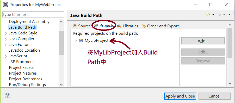 - [Projects]頁籤,可以將其他專案從這裡加入成為此專案的程式庫。此圖示範的已將MyLibProject加入MyWebProject: