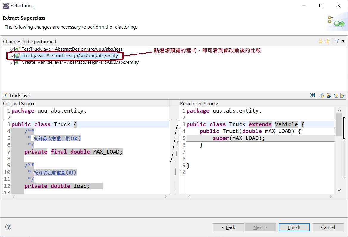 2. 點選[eclipse]功能選單[refacter]->[ Extract Super Class],出現對話窗如下圖: