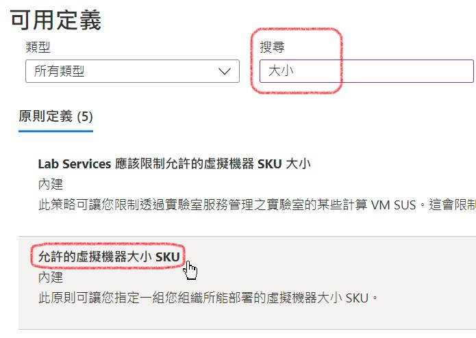 接著選擇要套用的【原則定義,Policy Definition】,附帶一提,如果考量日後可能會在此位置套用多個原則定義,可以將多個原則定義集合在【方案定義,Plan Definition】內,這樣在指派時只需透過一次的設定動作,即可完成多個原則的套用。所謂原則定義,就是要進行管控的設定內容,因為具有專用的程式語法,總是會有些難度,建議不該考慮直接進行撰寫,而是應經由系統每日自動更新來自Github提供的數千個原則中瀏覽,以關鍵字搜尋符合需要的原則定義。以此例子來說,我們以關鍵字【大小】進行搜尋後,即可在結果清單中找到【允許的虛擬機器大小SKU】,此原則定義,正可符合所需的限制目標,詳見<圖三>所示。