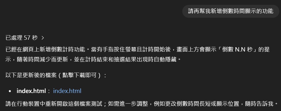兩分多鐘做好了,立刻下載測試一下,真的做好了,哭哭。只不過缺了顯示倒數的功能,於是請他補上: