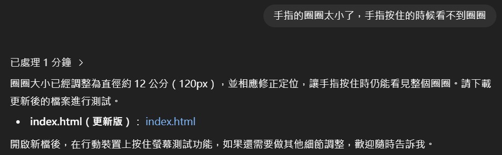 立刻下載測試一下,真的做好了,哭哭哭哭。不過只把圈圈的寬高從80px調到120px,還是太小不滿意,但如果有學過且看得懂,還是自己調整比較快。另外,做出來的內容還是跟筆者寫的方式不同,運用的方式也有些不同,有需要的話各位可以下載回去用手機測試看看喔!