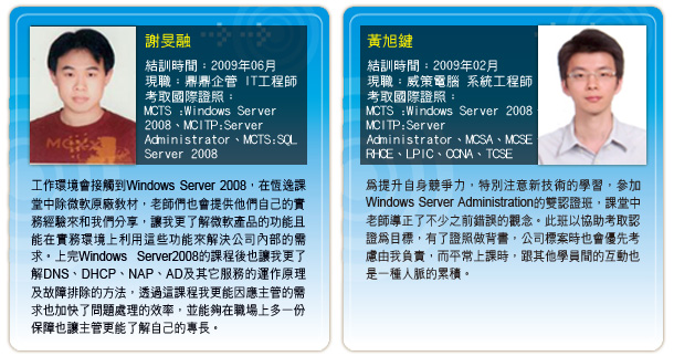 | 全球分析師公司IDC預估第一年將會有超過350萬的Windows Server部署,目前趨勢、興奇、BenQ、南亞、友達、台新、艾思妮(虛擬化技術)、財金資訊(虛擬化技術)、遊戲橘子(虛擬化技術)、達方(虛擬化技術)、麥當勞(終端機服務)、中鋼(NAP)、南科(NAP)等公司,已紛紛加入Windows Server 2008的行列。 Windows為目前台灣是佔率最高的作業系統,微軟認證已是網路管理工程師類職務的必備認證,隨著企業跟進Windows Server 2008的升級潮,Windows Server 2008的技術人才需求隨之趨增。率先取得Windows Server 2008 MCTS/MCITP認證,當公司或客戶要進行評估採納與部署時,您便可搶先爭取專案機會,穩固自己的職場競爭力。 |