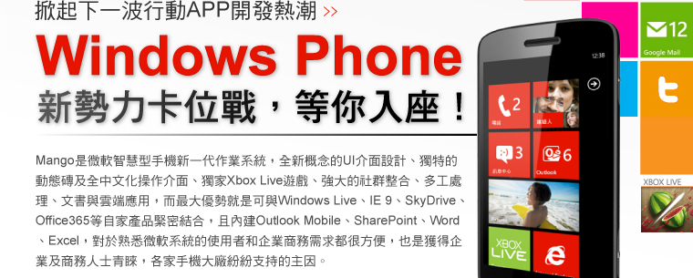 恆逸精心規劃「使用Visual C# 2010開發Windows Phone應用程式課程」,從Windows Phone基本觀念、應用程式開發、到上架Windows Phone市集,完整的開發流程學習,讓您用最熟悉的程式語言,最短時間內瞭解如何利用Silverlight Framework有效率的設計商業型Silverlight應用程式,及使用XNA Framework開發酷炫的手機遊戲,快速踏入Windows Phone手機開發領域!
