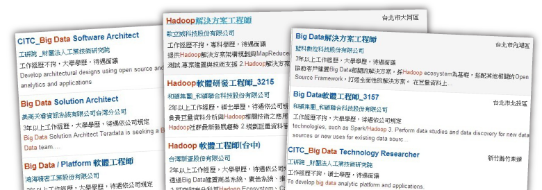| Google、Facebook、Yahoo、Twitter科技龍頭企業在應用 Hadoop處理大數據分析上有相當好的成效;eBay、Wal-Mart也使用 Hadoop來分析顧客搜尋商品的行為,創造新商機;台積電、中華電信、PChome online等來愈多企業也引用Hadoop技術, Hadoop人才儼然成為企業挖角的對象之一,Hadoop的搶人大戰已在人力市場上積極運作。 |