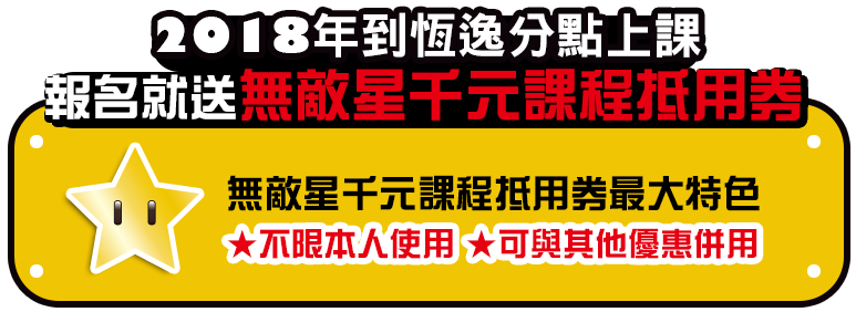 只要報名恆逸新竹、台中、高雄分點公開班課程(不限金額/種類),即可獲得無敵星千元課程抵用券